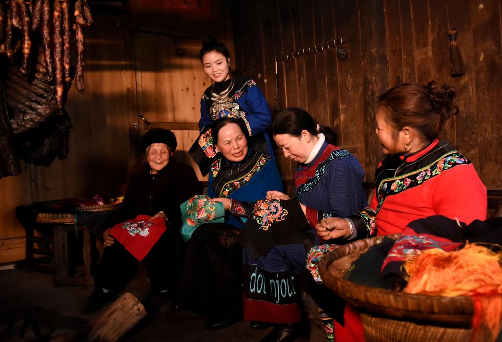 石麗平(右三)和繡娘們切磋交流苗繡技藝。新華社發(龍元彬攝)