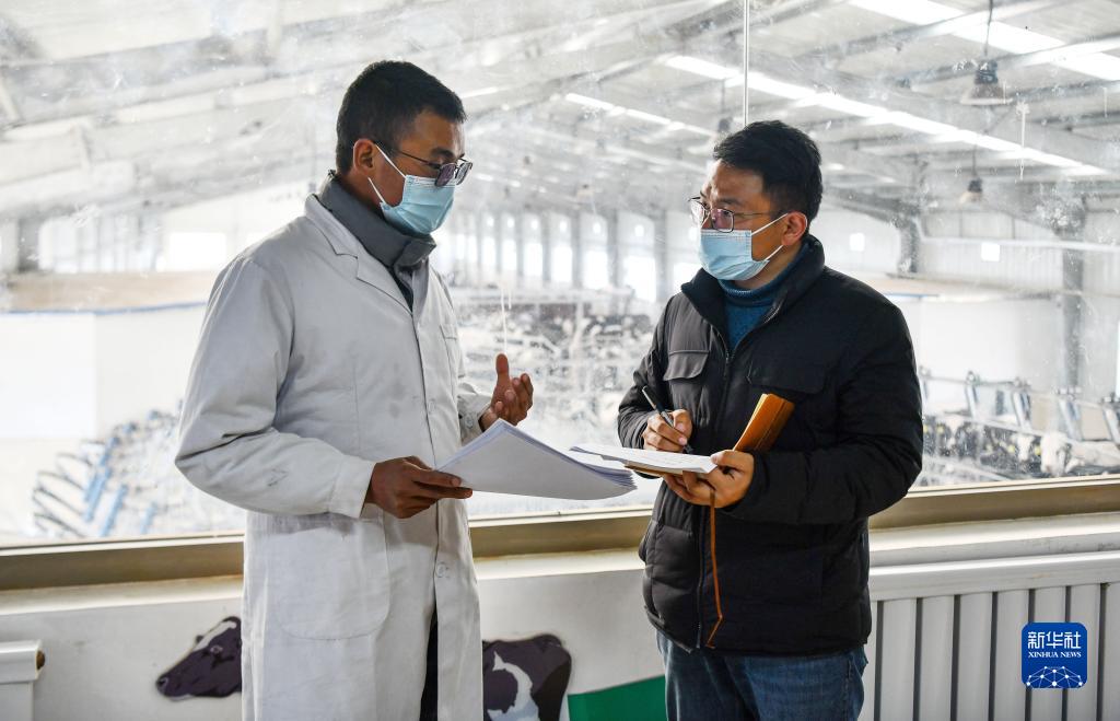 扎西江村(右)在隆子縣一家標準化奶牛養殖基地調研當地產業發展和帶動群眾增收情況(2月14日攝)。新華社記者 晉美多吉 攝