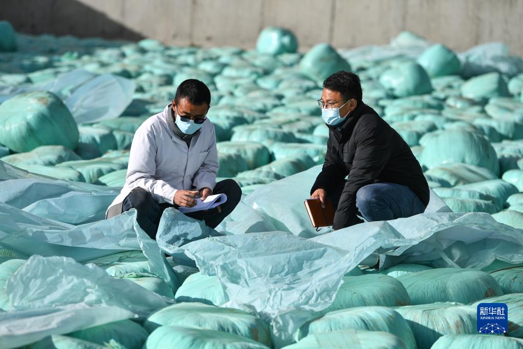 扎西江村(右)在隆子縣一家標準化奶牛養殖基地查看牛飼料,調研當地產業發展情況(2月14日攝)。新華社記者 晉美多吉 攝