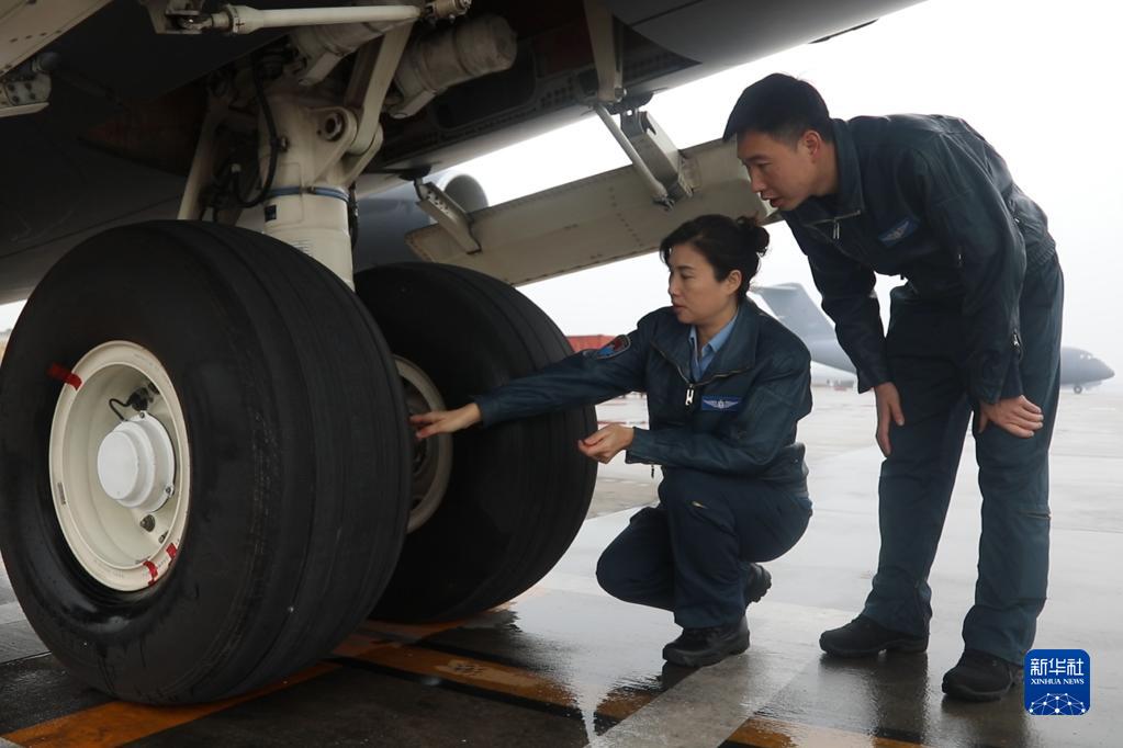 全國人大代表、空軍特級飛行員陳金蘭(左)在飛行前檢查運-20飛機起落架情況(1月14日攝)。?新華社發(劉卓超攝)