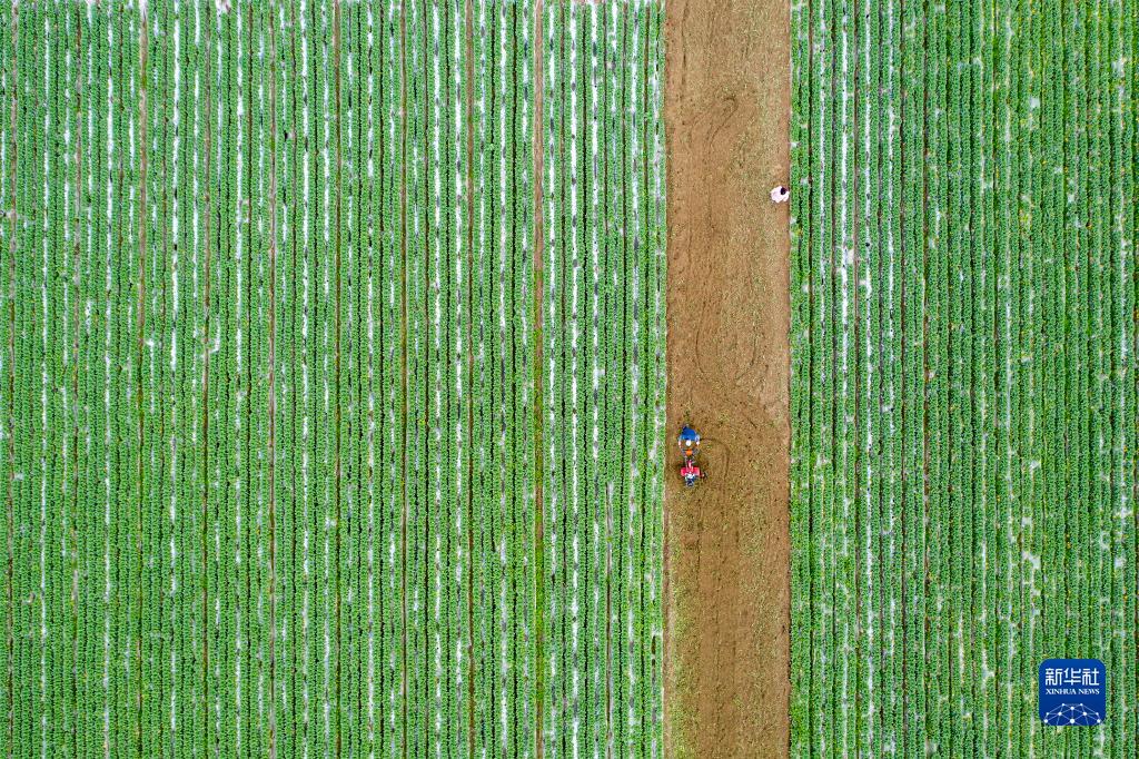 在四川省閬中市彭城鎮,村民駕駛農機翻耕菜地(2月23日攝,無人機照片)。新華社發(王玉貴 攝)