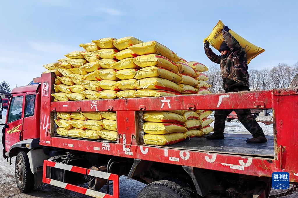 北大荒集團五大連池農場科技服務中心工人在裝運肥料(2月16日攝)。新華社發(陸文祥 攝)
