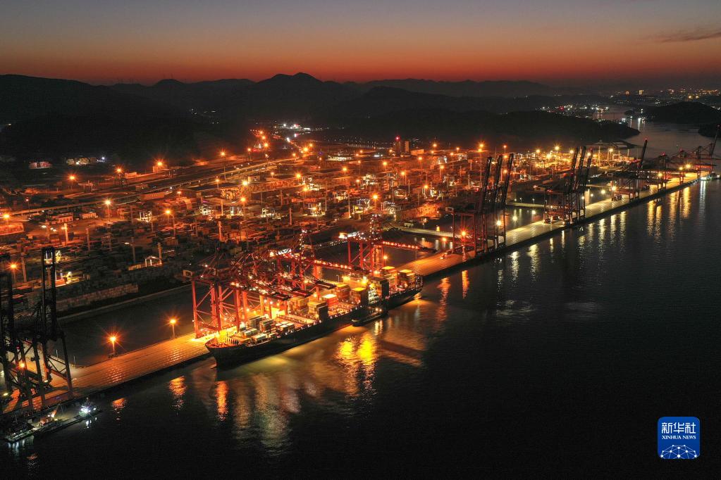 夜幕下,一艘貨輪??吭趯幉ㄖ凵礁鄞┥礁蹍^集裝箱碼頭(1月31日攝,無人機照片)。新華社記者 黃宗治 攝