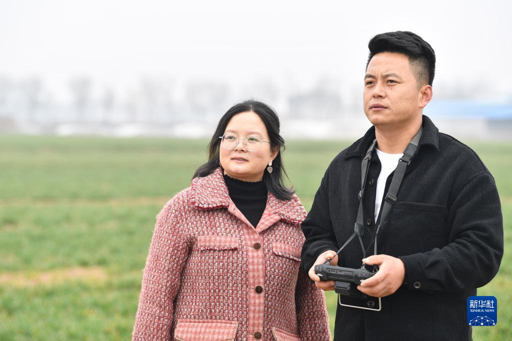 在陜西省寶雞市陳倉區慕儀鎮齊西村的農田,齊葉葉與齊昆(右)操控植保無人機管護作物(2023年2月27日攝)。新華社記者 張博文 攝