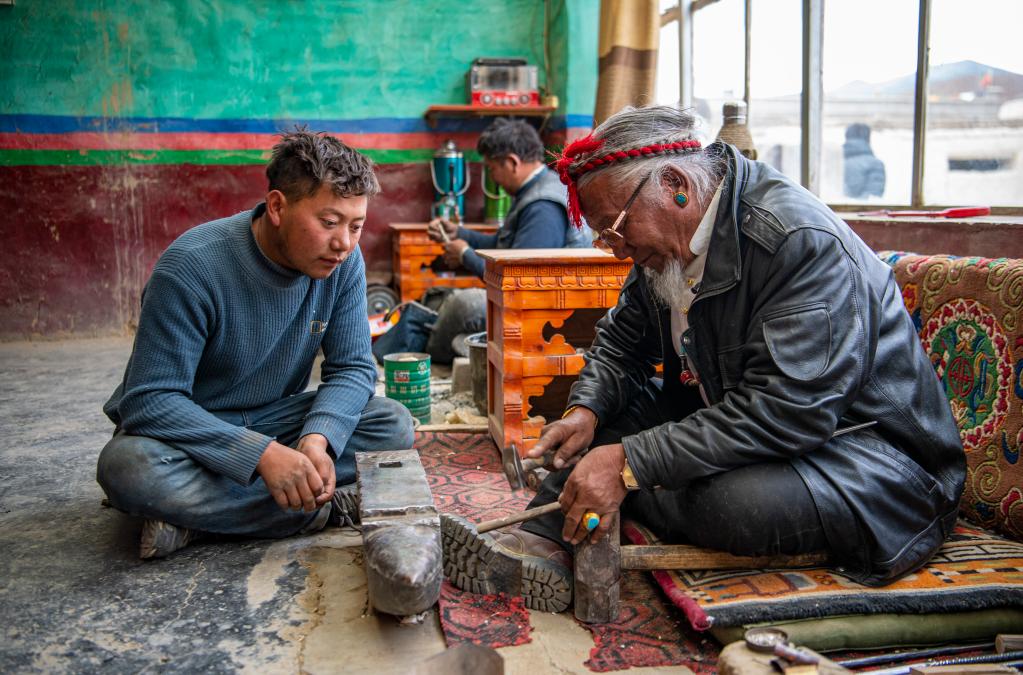 次旦旺加(右)正在指導孫子索朗珠拉藏刀鍛制技藝(3月17日攝)。新華社記者 孫非 攝