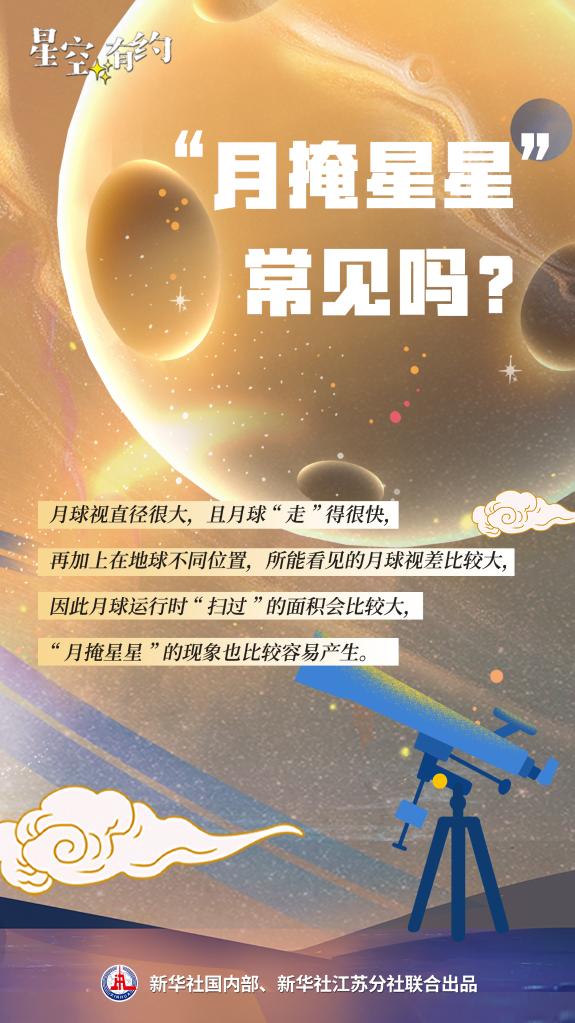 中科院紫金山天文臺科普部主管王科超介紹,月球在運行過程中,在視線方向上恰好遮擋住天體,就會形成“月掩星星”的現象,原理與日食類似?!霸虑蛞曋睆胶艽?,且月球‘走’得很快,再加上在地球不同位置,所能看見的月球視差比較大,因此月球運行時‘掃過’的面積會比較大,‘月掩星星’的現象也比較容易產生?!?/p>