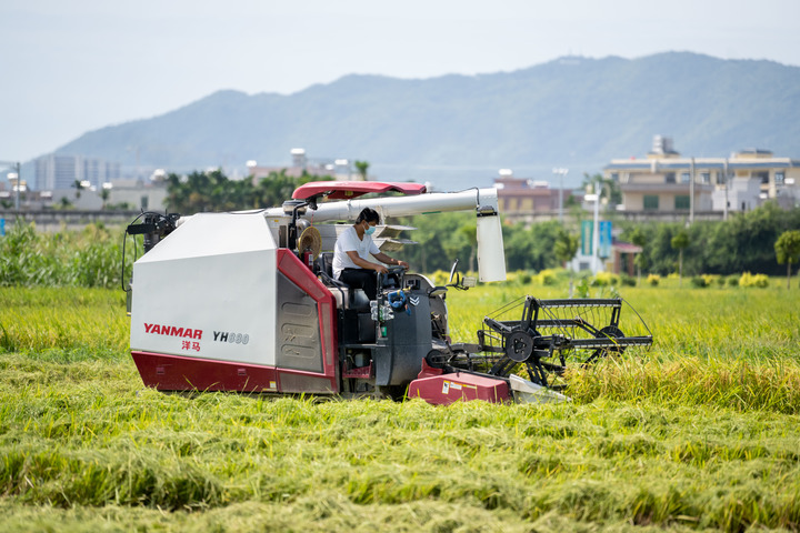 2022年7月,農機手在三亞市崖州區(壩頭)南繁公共試驗基地收割水稻。新華社記者胡智軒 攝