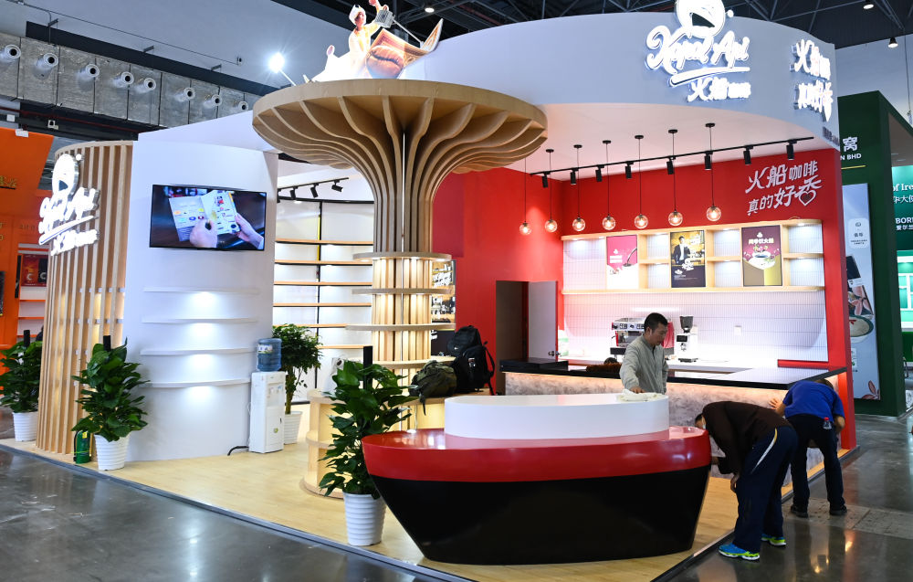 印尼咖啡企業火船咖啡展臺基本搭建完成(4月7日攝)。新華社記者 楊冠宇 攝