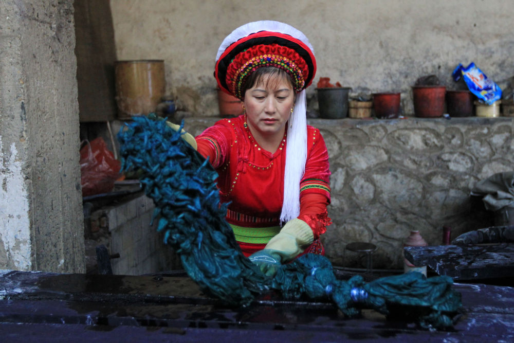 蒼山腳下、洱海之畔,綠樹紅花競相開放。在云南省大理市喜洲鎮周城村,青瓦白墻的璞真扎染博物館內,一位位白族村民的手下,藍白交織的白族扎染正在如花綻放。