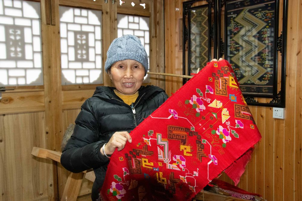 2022年1月7日,土家織錦國家級非遺傳承人劉代娥在湖南省龍山縣苗兒灘鎮撈車村展示自己做的土家織錦。新華社記者 柳王敏 攝