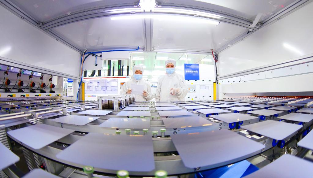 在晶澳太陽能科技股份有限公司,工作人員正在記錄智能化生產線運行情況。新華社記者岳文婷 攝