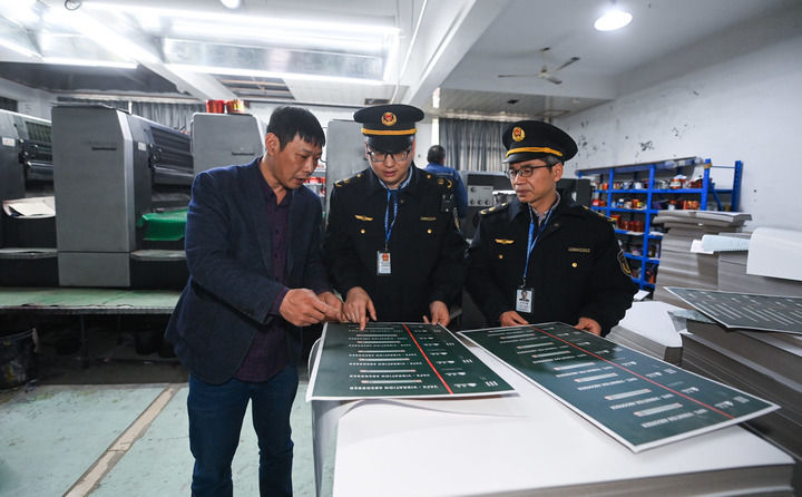 浙江諸暨市文化市場行政執法隊的工作人員在檢查印刷企業印刷品內容是否規范(2023年4月7日攝)。今年以來,諸暨市持續開展“凈化文化市場 護航杭州亞運”主題系列宣傳活動與專項執法檢查行動,重點打擊侵害知識產權、危害未成年人身心健康等文化市場違法行為。新華社記者 徐昱 攝