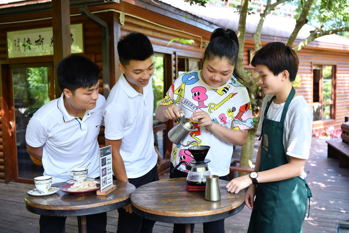 游客在萬寧隆苑咖啡莊園體驗制作手沖咖啡(2018年5月15日攝)。海南萬寧市以興隆華僑農場為依托,著力打造萬寧興隆咖啡產業。新華社記者 李鑫 攝