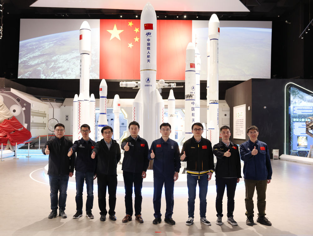 2023年4月14日,鄭興(左一)、郭朝禮(左二)、黃聰(右三)、朱海洋(右四)與同事在中國航天博物館合影。新華社記者 張晨霖 攝