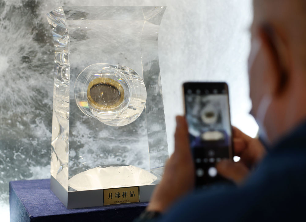 2023年4月24日,游客在中國航天博物館參觀展出的月球樣品。新華社記者 張晨霖 攝