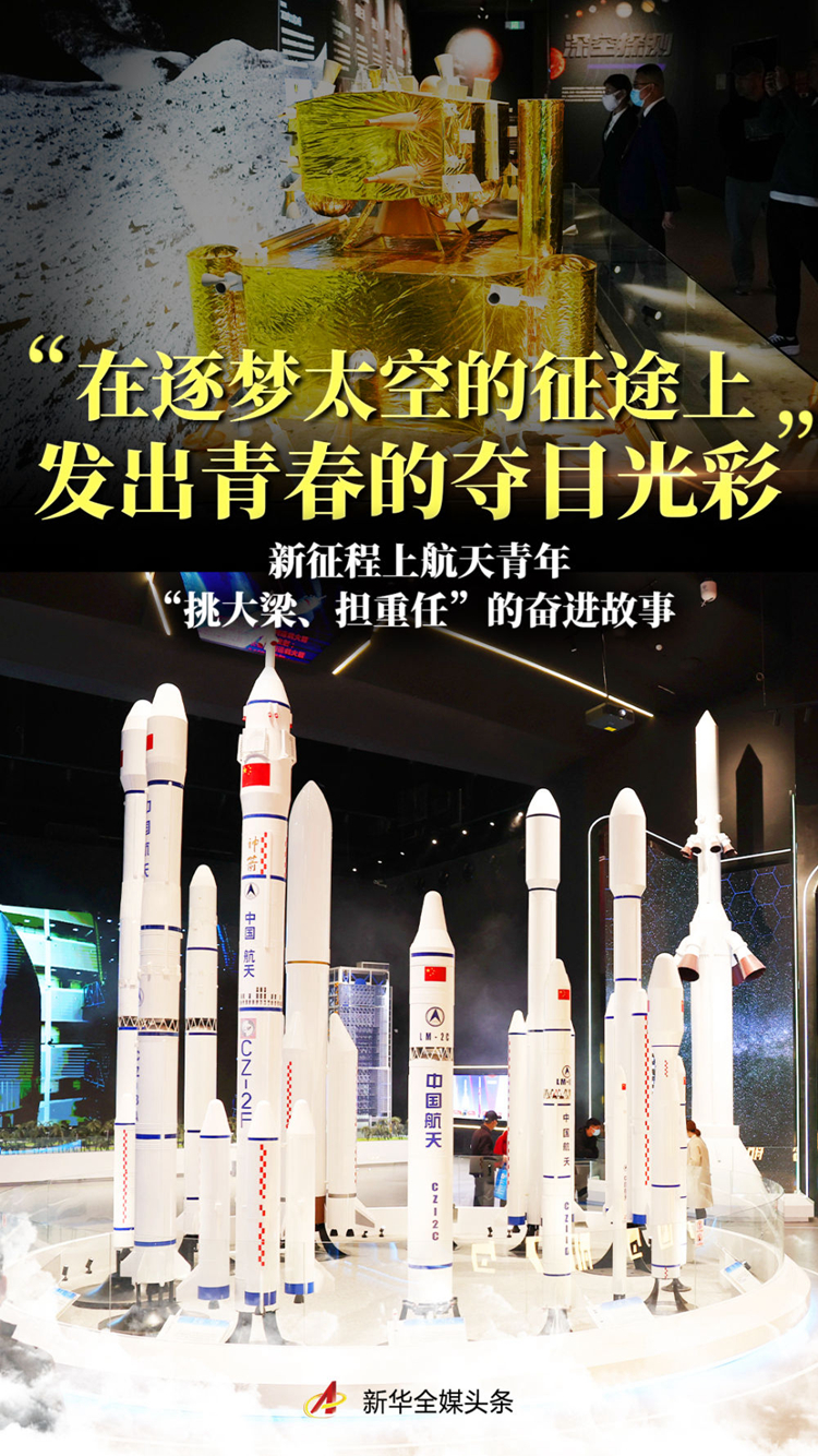 廣大航天青年始終牢記習近平總書記的重要囑托,踔厲奮發、勇毅前行,轉戰酒泉、文昌兩個發射場,研制三型火箭,用六次完美騰飛鑄就大國天宮,圓滿完成空間站建造任務。