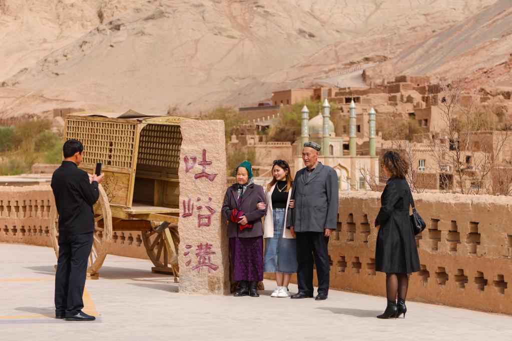 4月4日,游客在吐魯番市鄯善縣千年古村吐峪溝游玩。新華社記者郝昭 攝