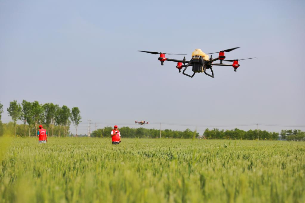樂陵市金農田農業機械服務農民專業合作社無人機操作手在托管麥田里進行“一噴三防”作業。新華社記者賈云鵬 攝
