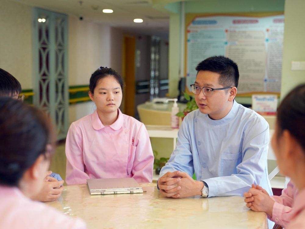 在上海市楊浦區社會福利院,護理主管王程(右)在護理員例會上點評發言(4月28日攝)。新華社記者 劉穎 攝