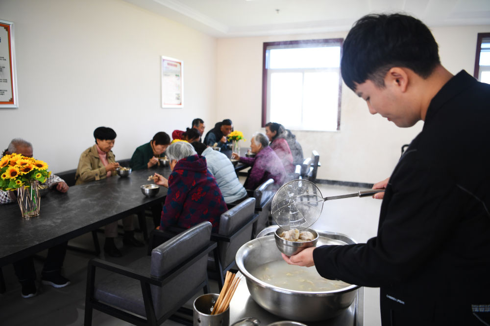 樊金林(右)在許昌福瑞園養老院為老人盛餃子(4月25日攝)。新華社記者 張浩然 攝