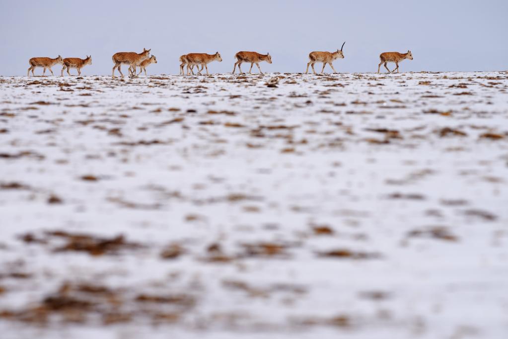 2021年4月20日,一群藏羚羊向卓乃湖方向行進。
