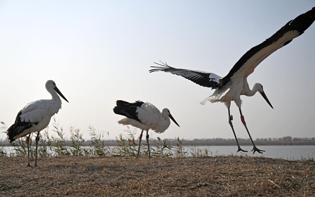 2022年11月23日,3只被救助的東方白鸛在七里海濕地重返自然。