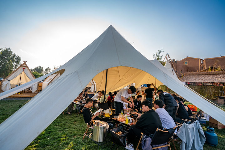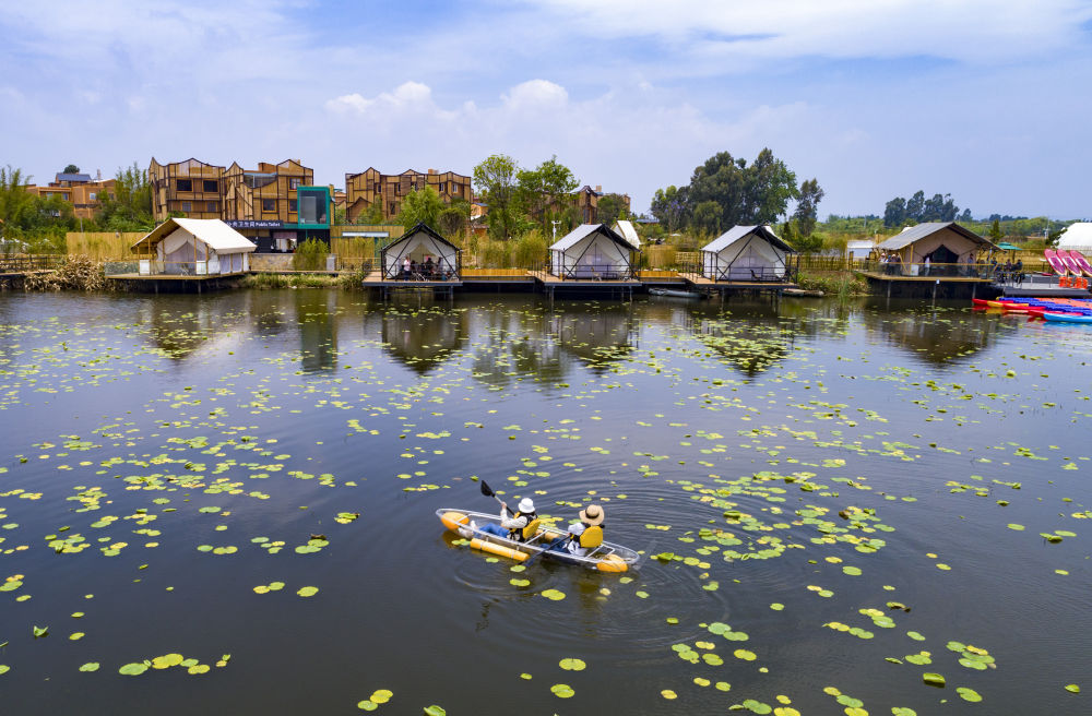 游人在滇池南岸晉寧區上蒜鎮小漁村露營游玩(2023年4月27日攝)。新華社記者 胡超 攝