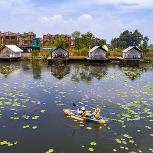 游人在滇池南岸晉寧區上蒜鎮小漁村劃船休閑(2023年4月30日攝,無人機照片)。新華社記者 陳欣波 攝