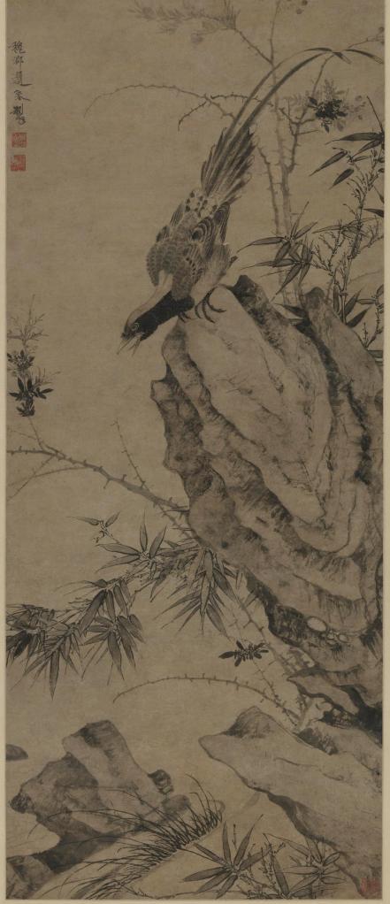 《起居平安圖》為紙本墨筆畫,描繪了溪邊奇石聳立、一禽鳥俯身向水鳴啼,灌木、修竹,溪水流動,生氣勃勃。
