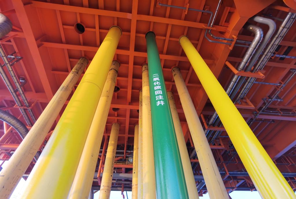 新華社深圳6月1日電(記者王攀 印朋)在蔚藍的南海,恩平15-1原油鉆采平臺穩穩矗立于海面之上。在這座巨大平臺扎入海床的眾多管道中,一條綠色管道格外引人注目——成百上千噸的液態二氧化碳正通過這條特殊管道,源源不斷回注海平面800米之下的地層之中。