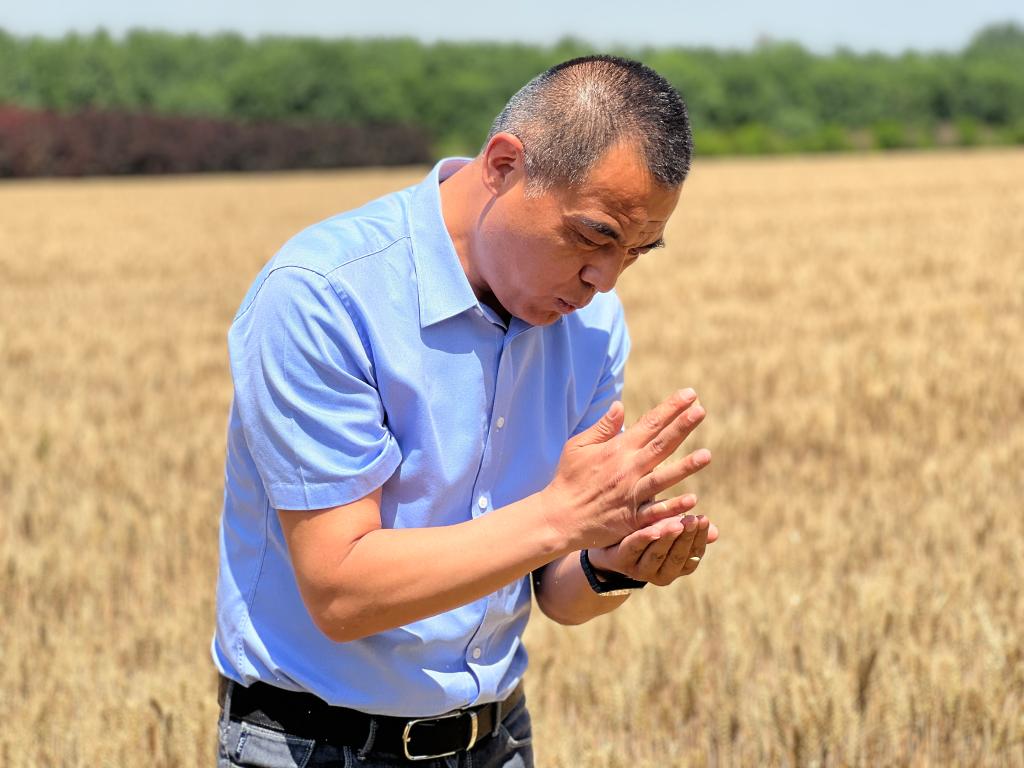 山東省淄博市桓臺縣果里鎮李王村黨支部書記陳海峰正在麥田里查看麥粒灌漿情況。新華社記者 葉婧 攝