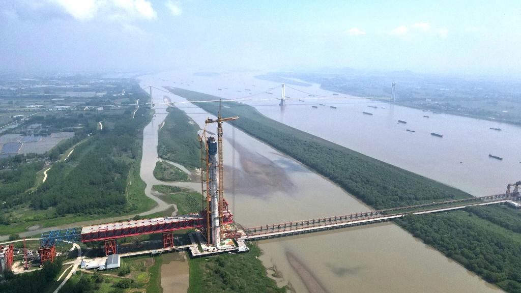 這是馬鞍山公鐵兩用長江大橋3號主塔(4月26日攝,無人機照片)。