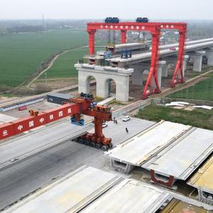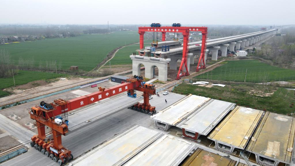 這是3月29日拍攝的中鐵四局巢馬城際鐵路箱梁架設現場(無人機照片)。