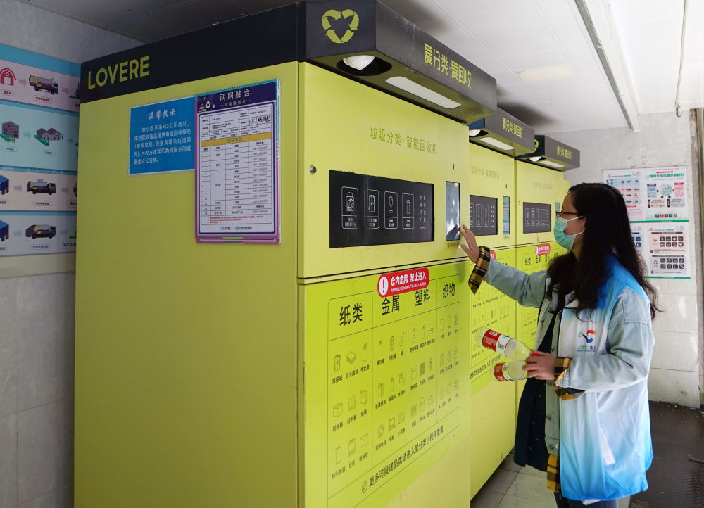5月23日,在上海市虹口區嘉興路街道愛家豪庭小區,垃圾分類志愿者在演示垃圾分類智能回收機的使用。新華社記者 劉穎 攝