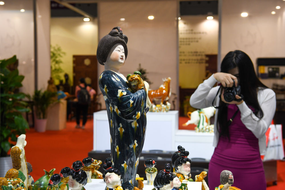6月8日,觀眾在文博會上拍攝“唐三彩”擺件。新華社記者 梁旭 攝