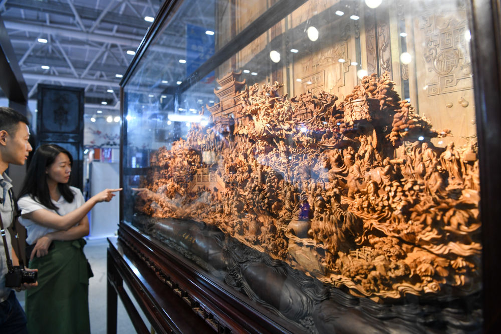 6月8日,觀眾在文博會上欣賞莆田木雕作品。新華社記者 梁旭 攝