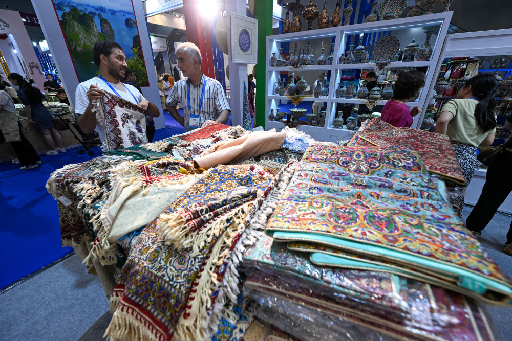 6月8日,來自伊朗的參展商在第十九屆文博會伊朗展臺整理地毯。新華社記者 毛思倩 攝
