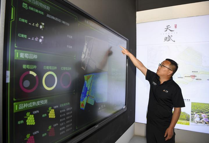 6月5日,中糧長城天賦酒莊總經理都振江在介紹酒莊的智慧葡萄園灌溉數據平臺。新華社記者 馮開華 攝