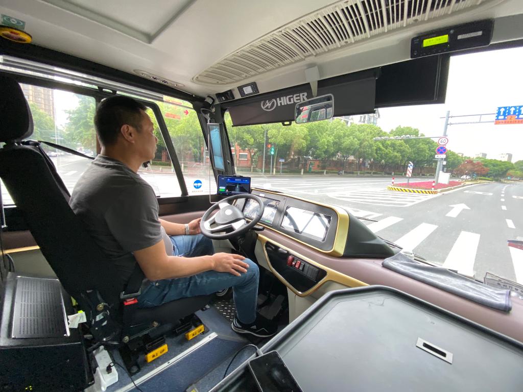 德清縣位于浙江北部,曾舉辦首屆聯合國世界地理信息大會。記者在該縣塔山森林公園公交站登上一輛純電動公交車,只見司機將車輛緩緩駛離車站后,開啟自動駕駛模式,隨后雙手離開方向盤。車輛根據路況,按照路面標線、信號燈等自動行駛,轉彎遇到人行道,會主動停車讓行。