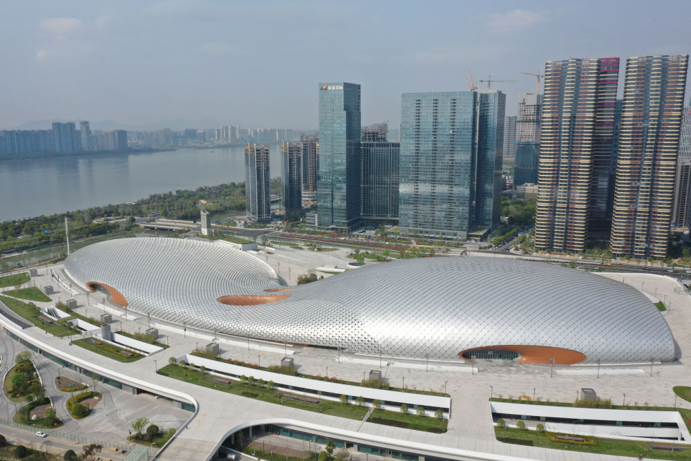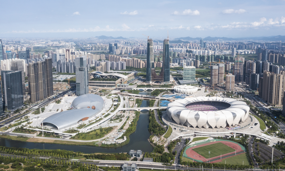 2021年8月2日拍攝的杭州奧體中心場館群(無人機照片)。新華社發(杭州亞組委供圖)