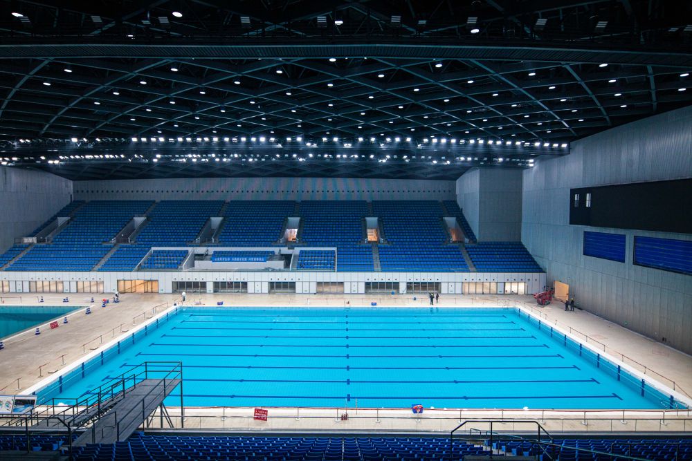 2021年4月12日拍攝的杭州奧體中心游泳館內景。新華社記者 江漢 攝