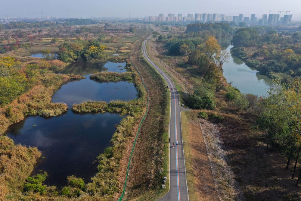 2022年11月12日,運動愛好者們在浙江省杭州市余杭區瓶窯鎮北湖草蕩生態濕地的健身游步道上參加健康跑比賽(無人機照片)。新華社記者 徐昱 攝