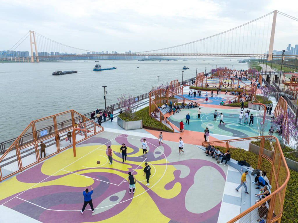 2023年3月26日,湖北省武漢市漢陽區楊泗港都市T臺“國風”籃球場。曾經廢棄的貨運碼頭變身新潮時尚籃球場和臨江公園。新華社記者熊琦 攝