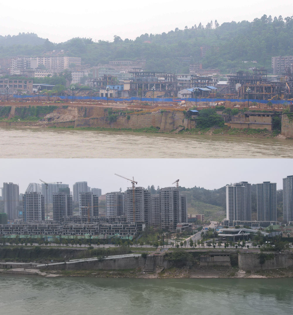 這是一張拼版照片,上圖為:在距離長江干流零公里處5公里的長江北岸,宜賓天原化工廠老廠區偌大的一片廠房正被拆除(2018年6月22日新華社記者胡旭攝);下圖為:在同一位置拍攝的原宜賓天原化工廠老廠區舊址今日新貌(無人機照片,2023年5月31日新華社記者劉坤攝)。新華社發