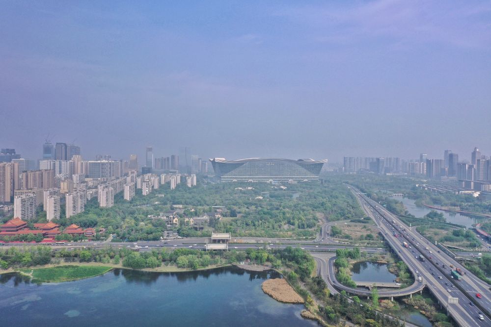 這是2022年4月6日拍攝的成都錦城湖及錦城公園(無人機照片)。新華社記者 劉坤 攝