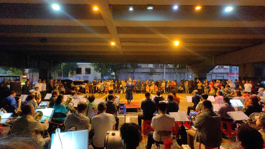“首先介紹一下今天的指揮,王輝老師……下面請欣賞吹奏樂《山楂樹》?!鄙碇炫鄣闹鞒秩藙Ⅺ惾A緩步下臺,隨著指揮快速揮動手臂,橋下被悠揚的音樂聲環繞,樂手們配合默契,觀眾也會跟著哼唱。樂曲奏畢,掌聲雷動。