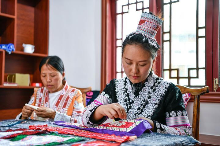 繡娘在貴州省黔西市一家非遺文化公司里制作苗繡(5月31日攝)。新華社記者 楊文斌 攝