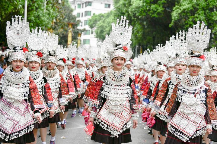 苗族姑娘們在參加貴州省臺江縣苗族姊妹節盛裝巡游(2021年4月25日攝)。新華社記者 楊文斌 攝