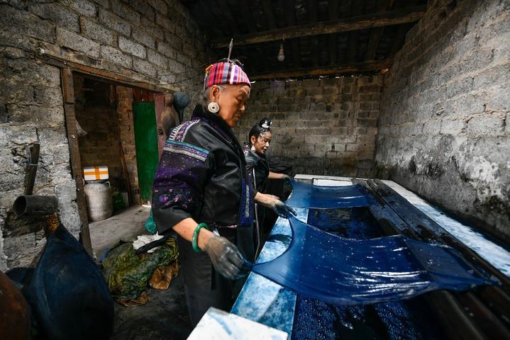 在貴州省臺江縣萃文街道仰黎坊,苗繡傳承人潘玉珍(前)與女兒張艷梅在染布(5月30日攝)。新華社記者 楊文斌 攝