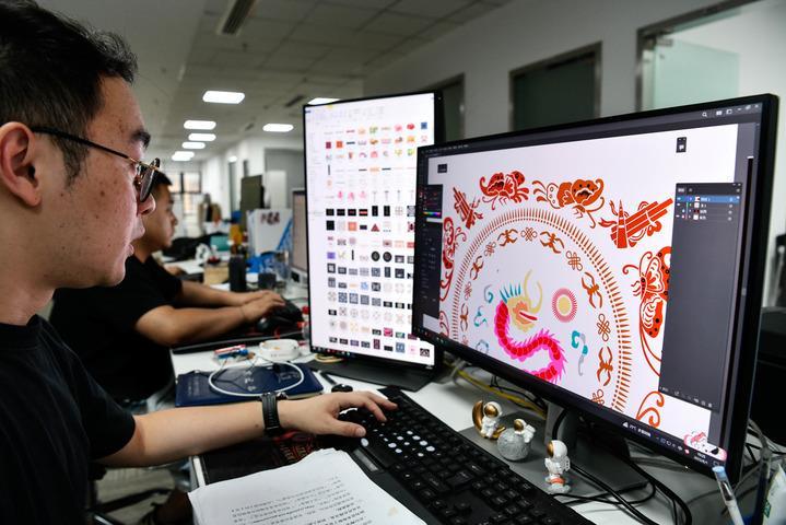 多彩貴州文化數據平臺有限公司的設計師在電腦上做苗繡矢量化提?。?月1日攝)。新華社記者 楊文斌 攝